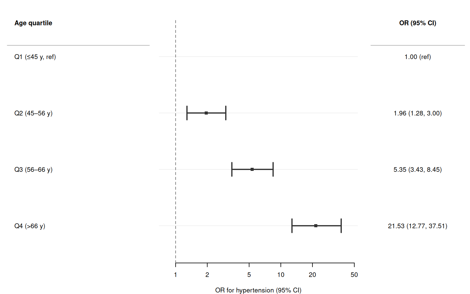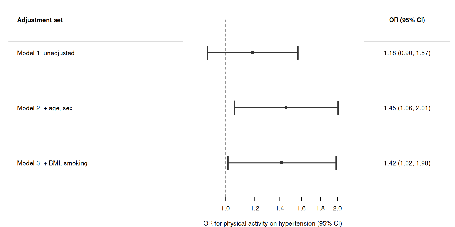 xlab = "OR for physical activity on hypertension (95% CI)"