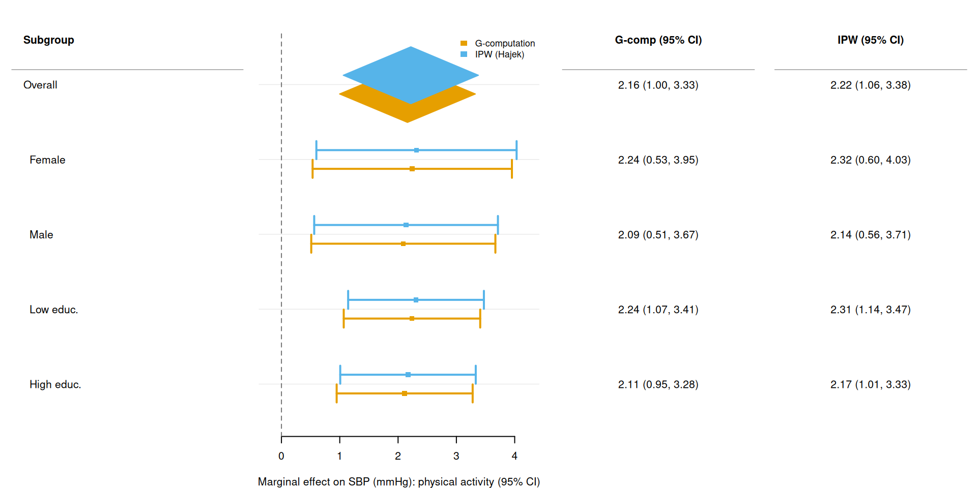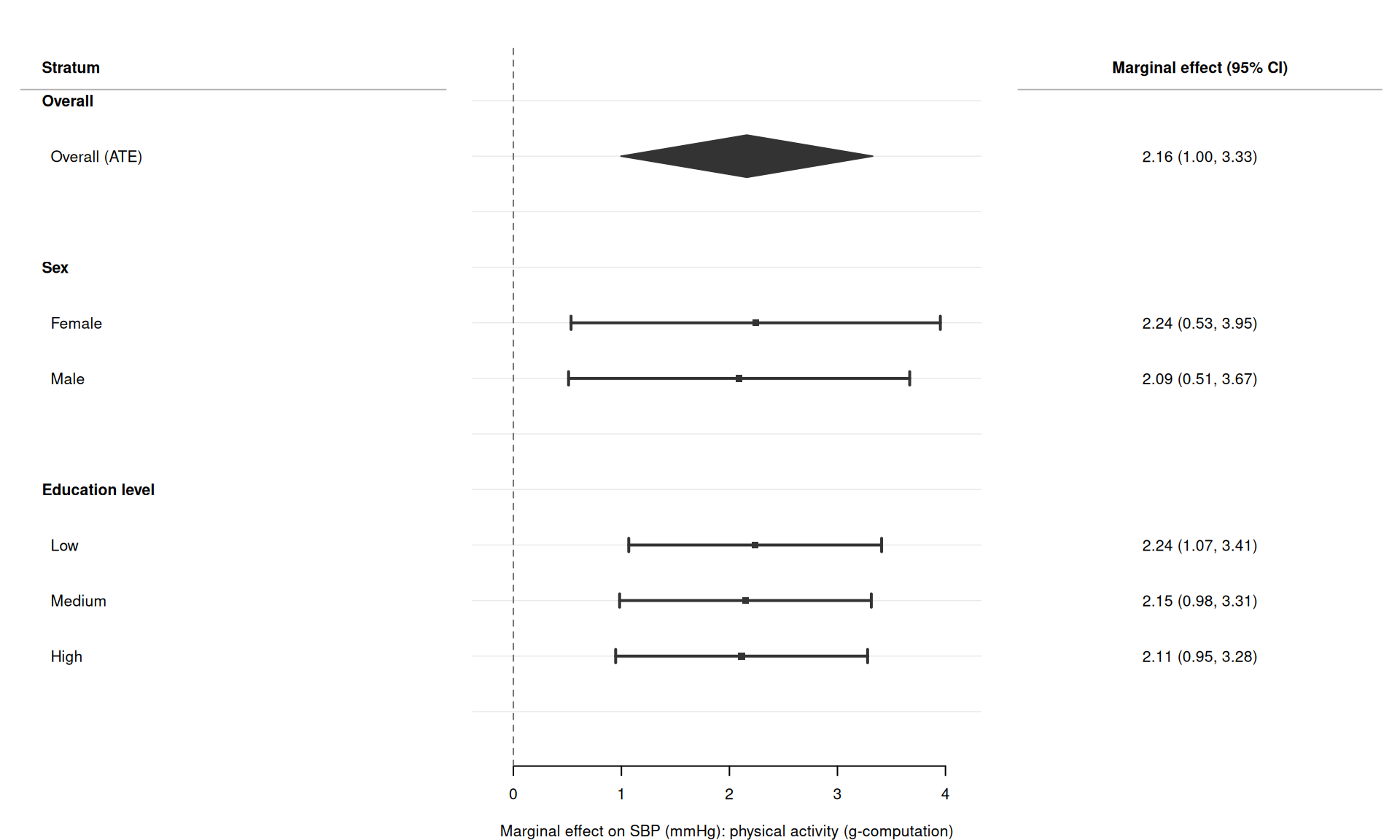 xlab = "Marginal effect on SBP (mmHg): physical activity (95% CI)"