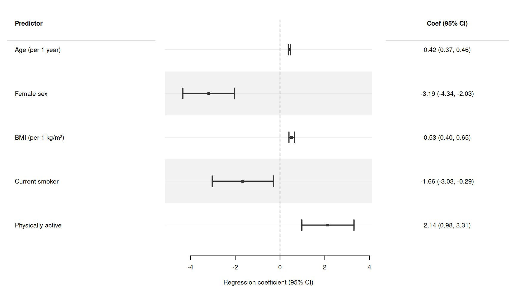 xlab = "Regression coefficient per IQR increase (95% CI)"